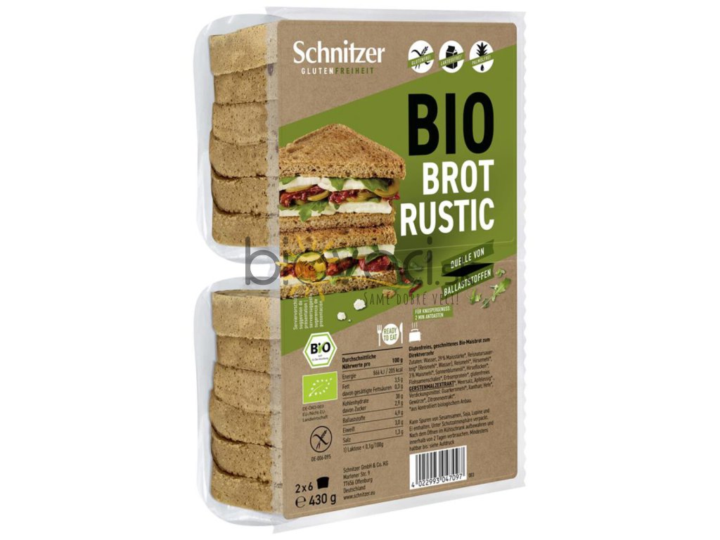| Prísady: | Voda, 29% kukuričný škrob*, prírodný ryžový kvások* (ryžová múka*, voda), ryžová múka*, prosná múka*, 3% kukuričná múka*, slnečnicový olej*, prosné vločky*, lupienky psyllia*, hrachový proteín*, bezlepkový extrakt z jačmenného sladu*, morská soľ, jablčný ocot*, zahusťovadlá: guarová guma*, xantánová guma, kvasnice*, korenie*, citrónový extrakt*. |