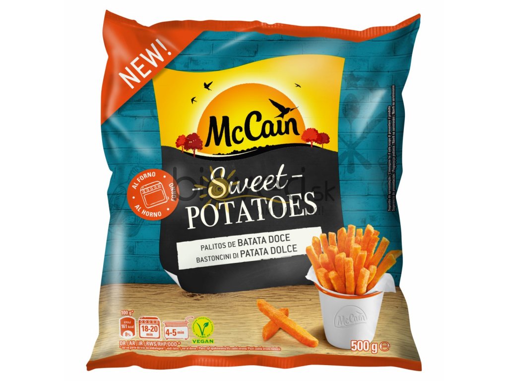 | Sladké zemiaky (86,5 %), obal (8 %) (rýžová a kukuričná múka, modifikovaný zemiakový škrob, dextrín, soľ, kypriace látky: E450 a E500, stabilizátor: xantánová guma, farvivá: paprikový extrakt a kurkumín), slnečnicový olej (5,5 %). |