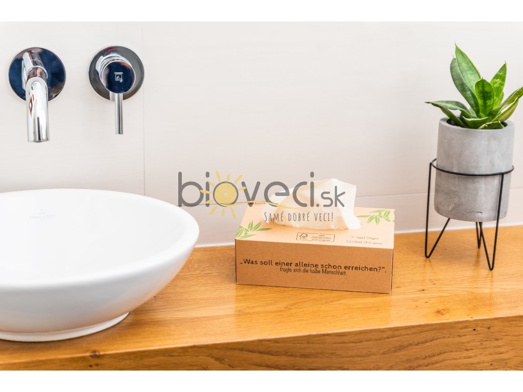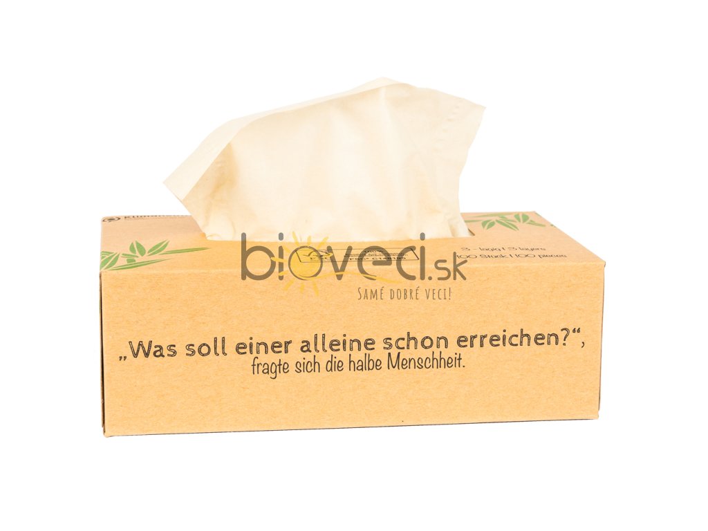 Pre tú najprirodzenejšiu vec na svete, niečo prirodzené pre svet! Takmer každý druhý priemyselne vyrúbaný strom na svete sa spracováva na papier, vrátane hygienického papiera, ako sú vreckovky a toaletný papier. V porovnaní s drevom rastie bambus oveľa rýchlejšie a je možné ho zbierať už po 3-5 rokoch. To znamená, že na tej istej ploche možno vyrobiť viac papiera a zachovať dôležité lesy.