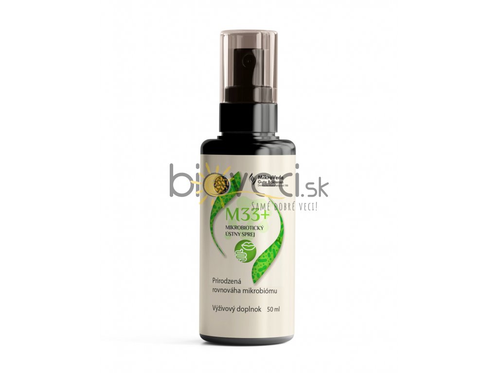 Mikrobiotický orálny sprej M33+ kolonizuje ústnu sliznicu a jazyk a pomáha vytvoriť a udržiavať zdravú bakteriálnu rovnováhu. Sprej obsahuje starostlivo vybrané, zosúladené, živé kmene bez GMO. Ako špeciálne fermentovaný nesterilizovaný orálny sprej ponúka ako doplnok výživy okrem množstva podporných baktérií, aj ďalšie základné enzýmy, bioaktívne rastlinné látky, antioxidanty a vitamíny.