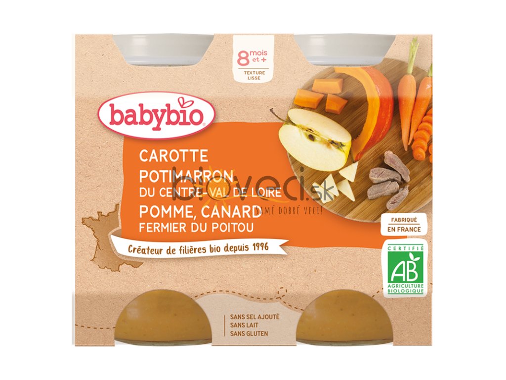 | Prísady: | "mrkva* 34 %, tekvica* 18 %, jablká* 17 %, voda z varenia, francúzska farmárska kačka* 8 %, cibuľa* 7 %, paštrnák* 6,5 %, repkový a slnečnicový olej*, rozmarín*, bez pridanej soli, bez lepku a mlieka. *zložky ekologického poľnohospodárstva". Varené v pare. |