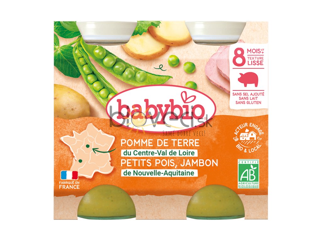 | Prísady: | hrášok* 70 %, voda z varenia,,šťava z citronu*. Bez pridanej soli, bez lepku a mlieka. *zložky ekologického poľnohospodárstva". Výrobok ekologického poľnohospodárstva. Určené na zvláštnu výživu dojčiat a malých detí. |