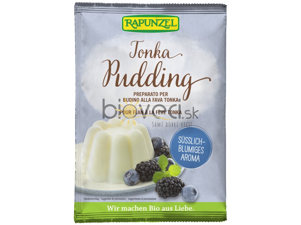 | Skladovanie a použitie: | Skladujte na chladnom a suchom mieste. Krémový puding s neporovnateľnou vôňou tonka bôbov na 500 ml mlieka. Pudingový prášok zmiešajte so 6 lyžicami studeného mlieka a 40 g trstinového cukru do hladka. Zvyšné mlieko privedieme do varu, odstavíme z ohňa a vmiešame rozmiešaný prášok. Znova krátko povaríme a potom vložíme do misy alebo do za studena vypláchnutej formy. Dajte do chladničky aspoň na 4 hodiny stuhnúť. |