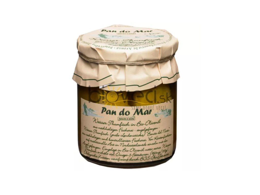 | Prísady: | biely TUNIAK**** (Thunnus alalunga) (70 %), extra panenský olivový olej* 29 %, morská soľ. *z kontrolovaného ekologického poľnohospodárstva. 29% prísad je z kontrolovaného ekologického poľnohospodárstva. |
