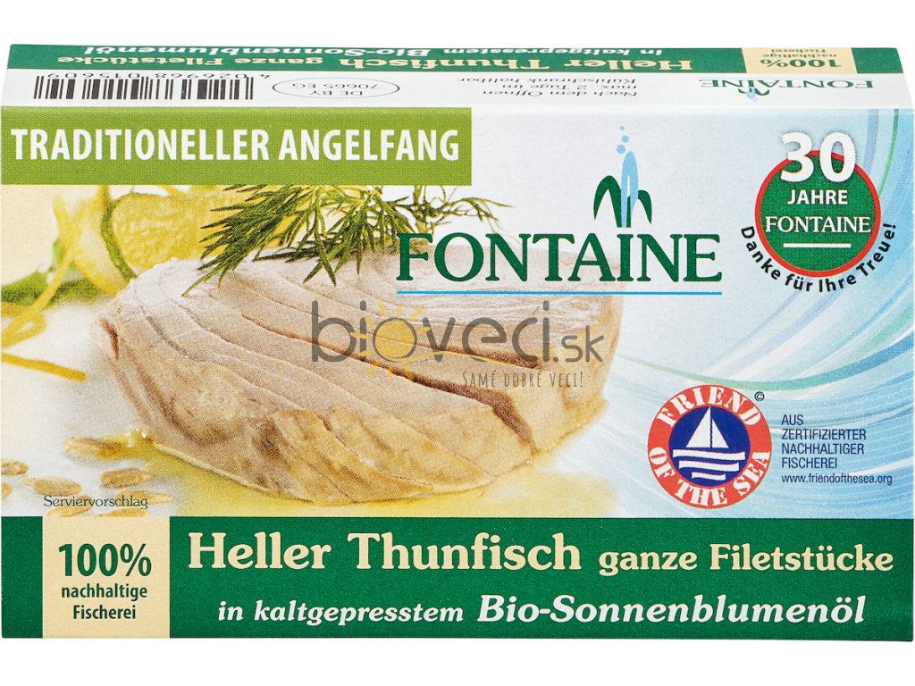 Svetlý tuniak Fontaine sa vyťahuje z vody jednotlivo pomocou rybárskeho prútu podľa smerníc trvalej udržateľnosti. Po ručnom rybolove nasleduje zodpovedné spracovanie a zušľachťovanie s najlepšími organickými prísadami. Okrem tuniaka obsahuje táto plnohodnotná konzerva iba morskú soľ a za studena lisovaný bio slnečnicový olej z nemeckého mlyna.