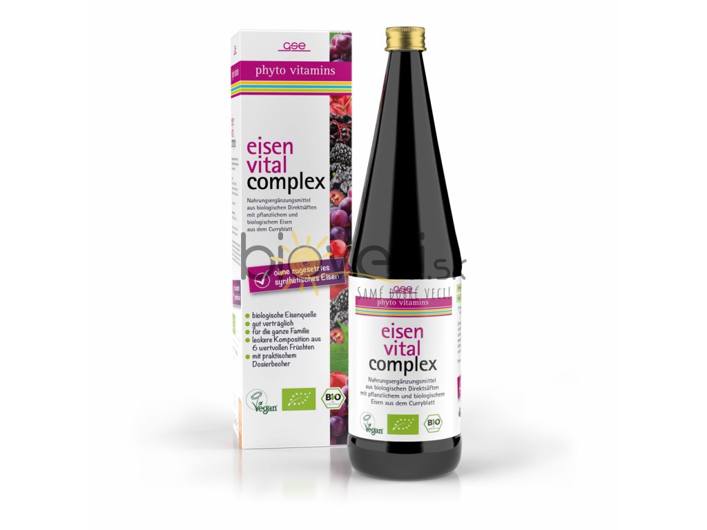 Iron Vital Complex (bio) Výživový doplnok vyrobený z organických nekoncentrovaných štiav s rastlinným a organickým železom z kari listu Železo - prispieva k normálnej tvorbe červených krviniek a hemoglobínu - prispieva k normálnemu transportu kyslíka v tele - prispieva k normálnemu energetickému metabolizmu - prispieva k zníženiu únavy a vyčerpania - prispieva k normálnej kognitívnej funkcii - prispieva k normálnej funkcii imunitného systému - podieľa sa na delení buniek